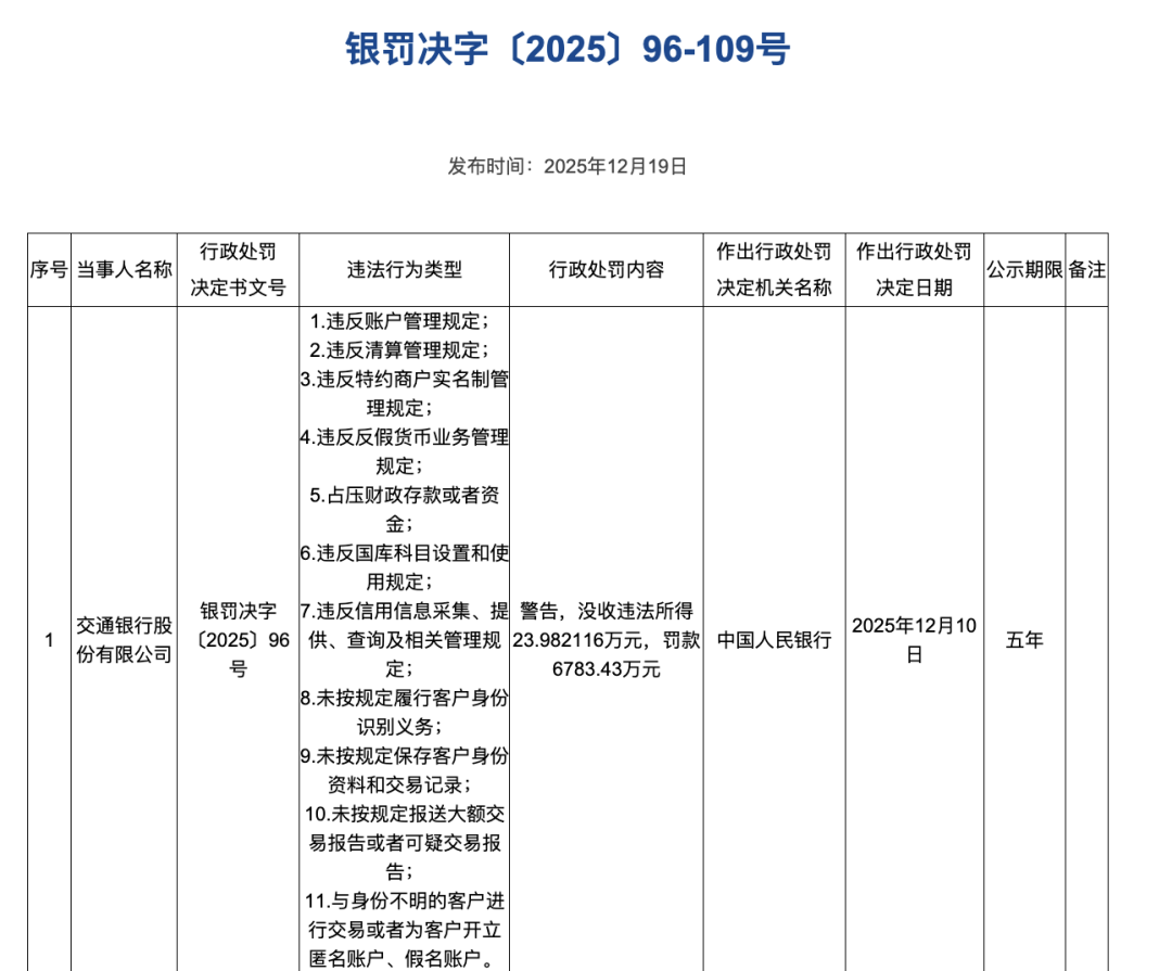 具体拆分来看,交通银行因涉及账户管理、清算管理、未按规定报送大额交易或可疑交易报告、与身份不明客户开展交易或为其开立匿名账户、假名账户等11项违规,被罚款6783.43万元,成为本次罚单一哥;与此同时,13名相关责任人一并被追责,罚款金额为0.4万元-17万元之间,其中2人被给予警告。