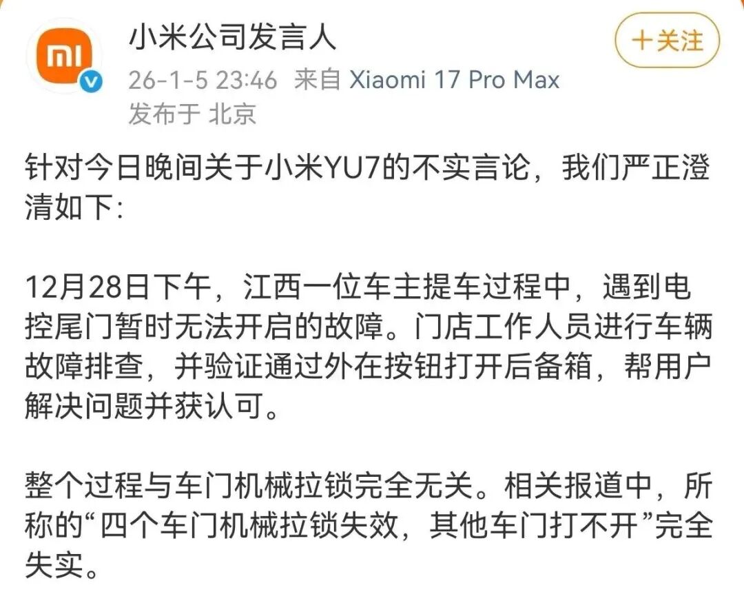 对此,当天深夜,“小米公司发言人”紧急在微博发布严正澄清,宣称:“门店工作人员进行车辆故障排查,并验证通过外在按钮打开后备箱,帮用户解决问题并获认可”,整个过程与车门机械拉锁完全无关。相关报道中,所称的“四个车门机械拉锁失效,其他车门打不开”完全失实。